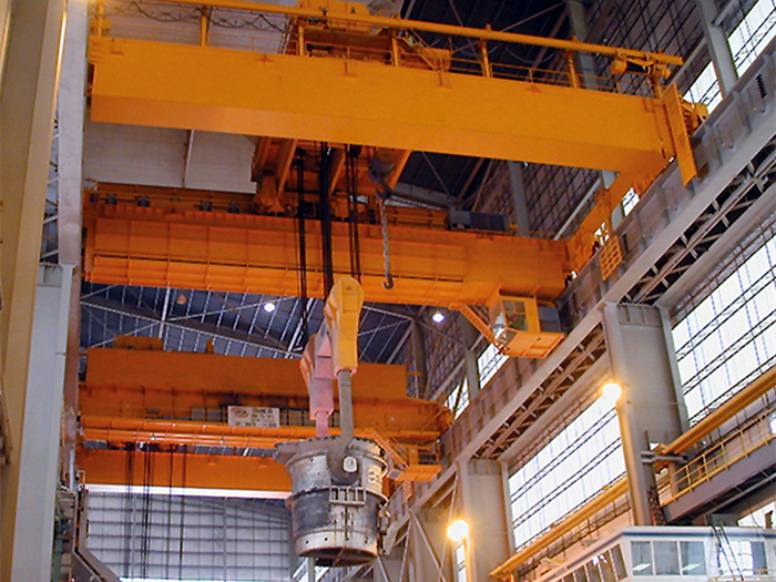 Une grue à double poche est composée d'un cadre de pont en caisson, d'un crochet, d'un mécanisme de déplacement de la grue et d'un système électrique. Le crochet principal utilise un outil de chargement comme dispositif de levage pour hisser une poche d'acier, le crochet auxiliaire coopère avec le crochet principal pour accomplir le coulage de l'acier fondu et du laitier d'acier et un autre levage auxiliaire.